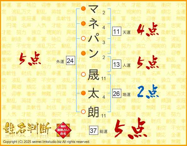 マ(2画)ネ(4画)パ(3画)ン(2画) 晟(11画)太(4画)朗(11画)
