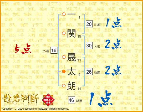 一(1画)関(19画) 晟(11画)太(4画)朗(11画)