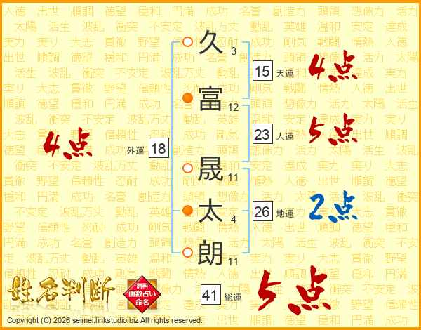 久(3画)富(12画) 晟(11画)太(4画)朗(11画)
