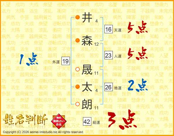 井(4画)森(12画) 晟(11画)太(4画)朗(11画)
