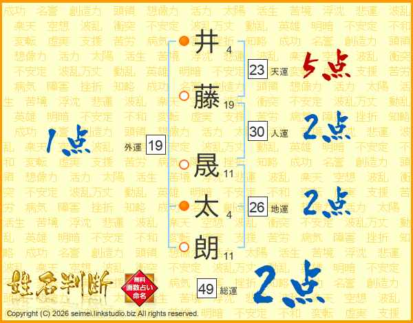 井(4画)藤(19画) 晟(11画)太(4画)朗(11画)
