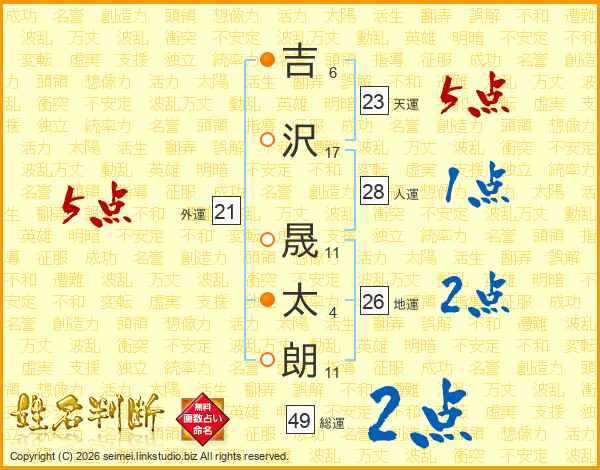 吉(6画)沢(17画) 晟(11画)太(4画)朗(11画)