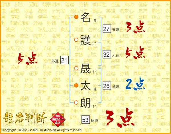 名(6画)護(21画) 晟(11画)太(4画)朗(11画)