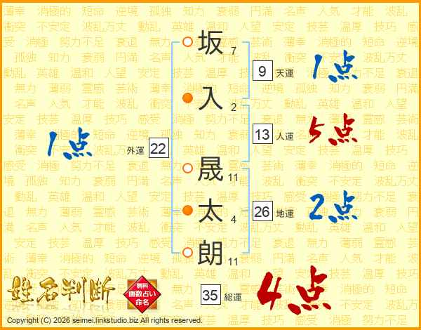 坂(7画)入(2画) 晟(11画)太(4画)朗(11画)