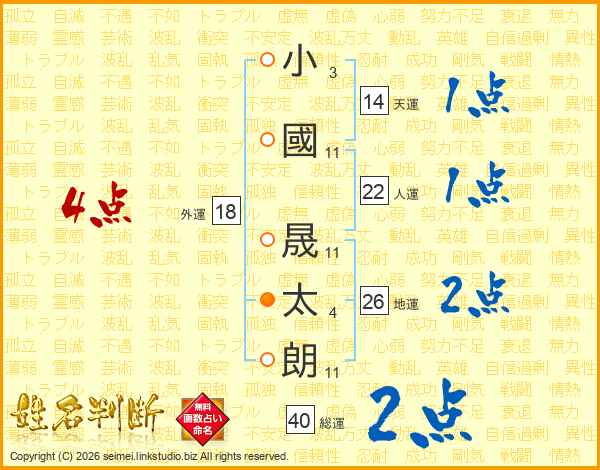 小(3画)國(11画) 晟(11画)太(4画)朗(11画)