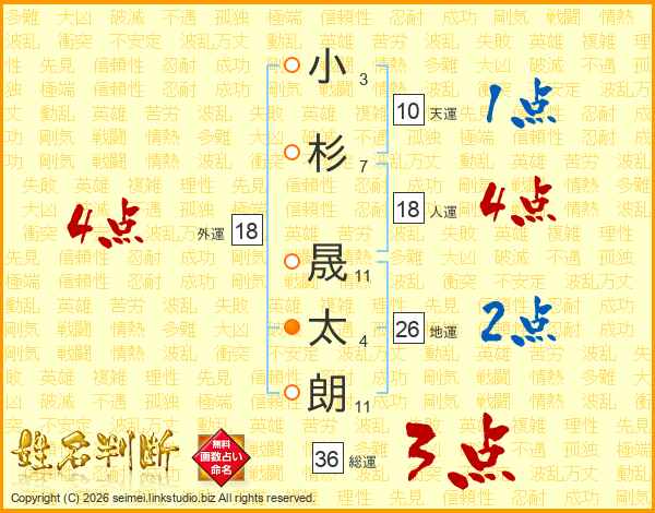 小(3画)杉(7画) 晟(11画)太(4画)朗(11画)