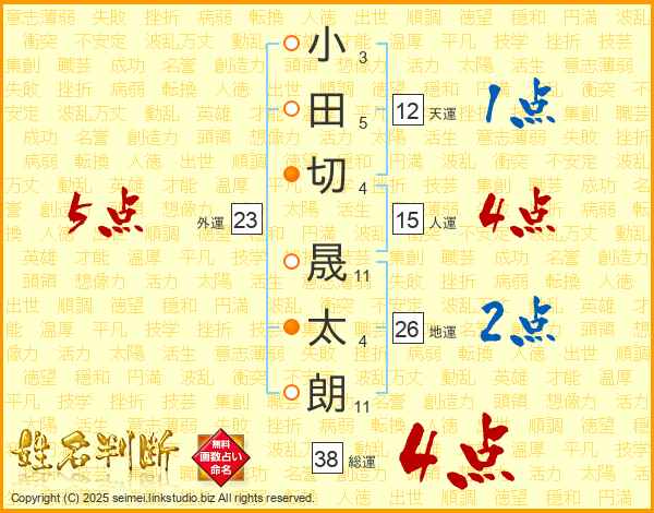 小(3画)田(5画)切(4画) 晟(11画)太(4画)朗(11画)
