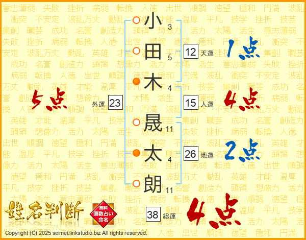 小(3画)田(5画)木(4画) 晟(11画)太(4画)朗(11画)