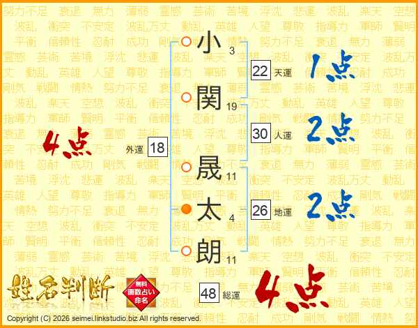 小(3画)関(19画) 晟(11画)太(4画)朗(11画)