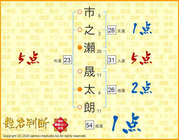 市(5画)之(3画)瀬(20画) 晟(11画)太(4画)朗(11画)