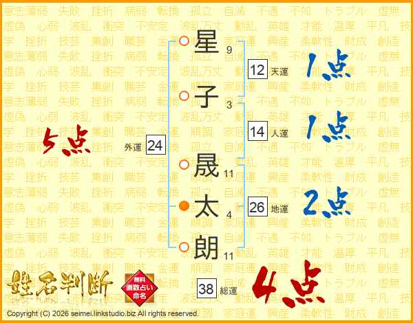 星(9画)子(3画) 晟(11画)太(4画)朗(11画)