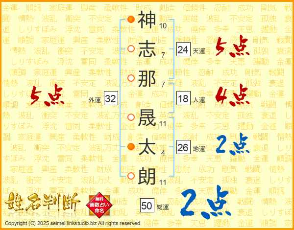 神(10画)志(7画)那(7画) 晟(11画)太(4画)朗(11画)
