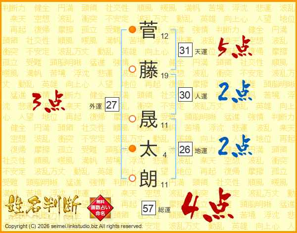 菅(12画)藤(19画) 晟(11画)太(4画)朗(11画)
