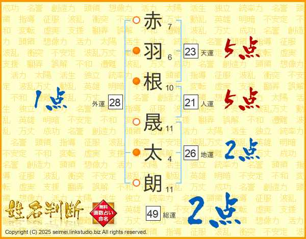 赤(7画)羽(6画)根(10画) 晟(11画)太(4画)朗(11画)