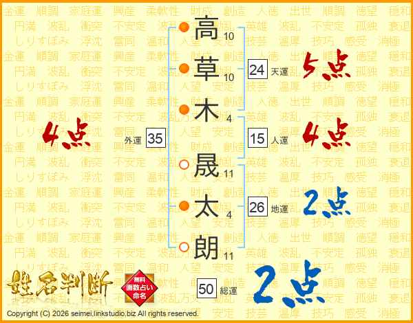 高(10画)草(10画)木(4画) 晟(11画)太(4画)朗(11画)