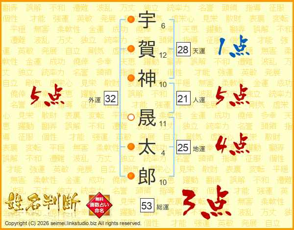 宇(6画)賀(12画)神(10画) 晟(11画)太(4画)郎(10画)
