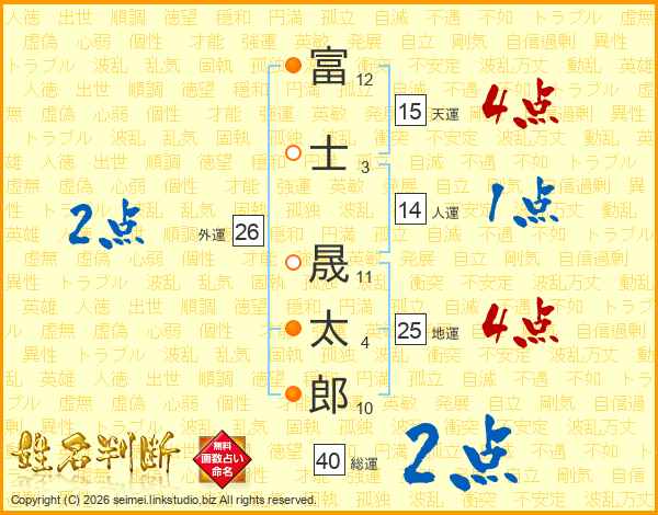 富(12画)士(3画) 晟(11画)太(4画)郎(10画)