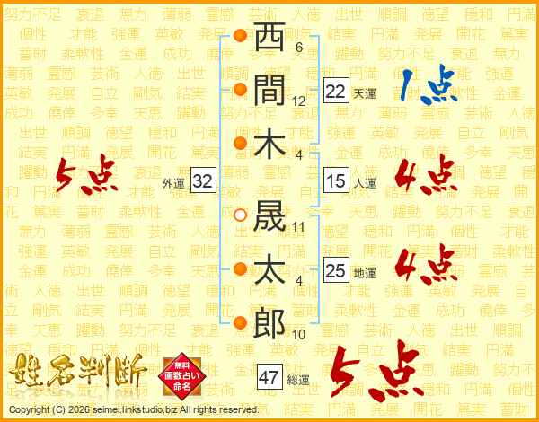 西(6画)間(12画)木(4画) 晟(11画)太(4画)郎(10画)