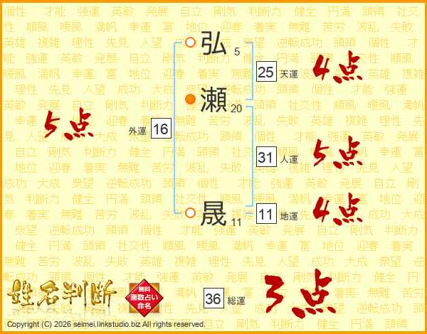 弘(5画)瀬(20画) 晟(11画)