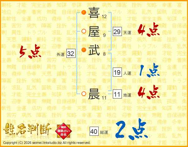 喜(12画)屋(9画)武(8画) 晨(11画)
