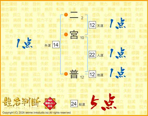生活面を象徴する運勢です。外部から受ける影響力を表し、結婚運、家庭運や職場、環境への順応性を表します。総運から人運を引いた画数。姓や名が1文字の場合を除く。