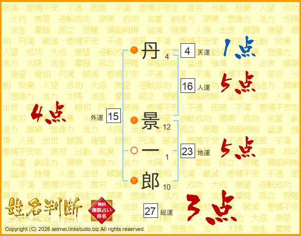 生活面を象徴する運勢です。外部から受ける影響力を表し、結婚運、家庭運や職場、環境への順応性を表します。総運から人運を引いた画数。姓や名が1文字の場合を除く。