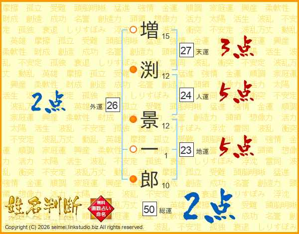 増(15画)渕(12画) 景(12画)一(1画)郎(10画)