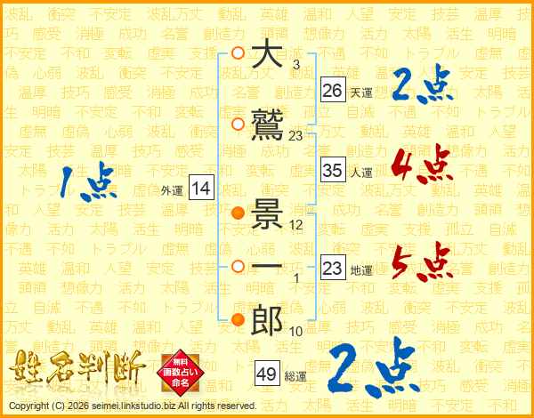 大(3画)鷲(23画) 景(12画)一(1画)郎(10画)