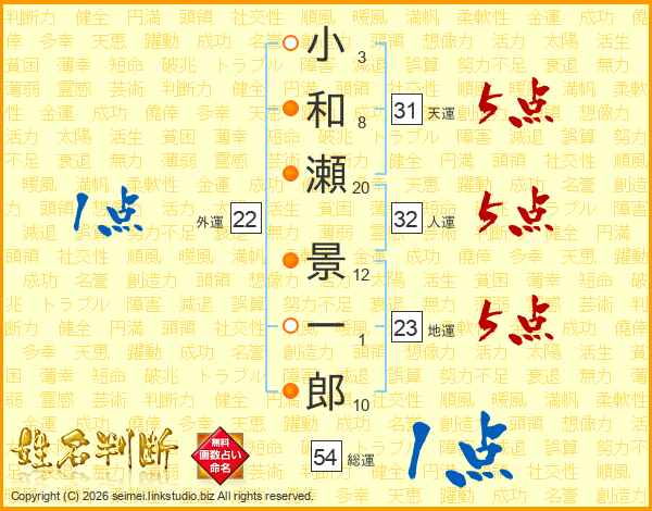 小(3画)和(8画)瀬(20画) 景(12画)一(1画)郎(10画)