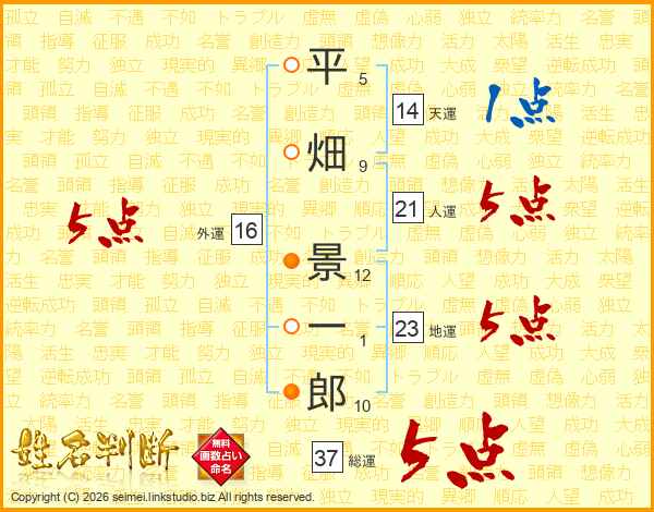 平(5画)畑(9画) 景(12画)一(1画)郎(10画)