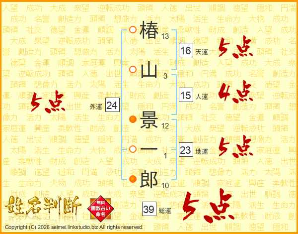 椿山景一郎さんの総運は39画の5点!