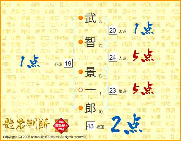 武(8画)智(12画) 景(12画)一(1画)郎(10画)