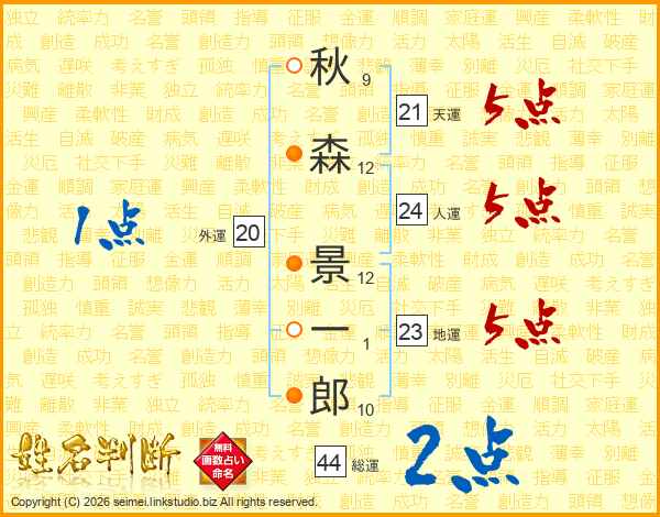 秋(9画)森(12画) 景(12画)一(1画)郎(10画)