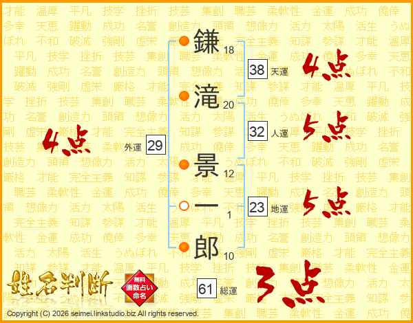 鎌(18画)滝(20画) 景(12画)一(1画)郎(10画)