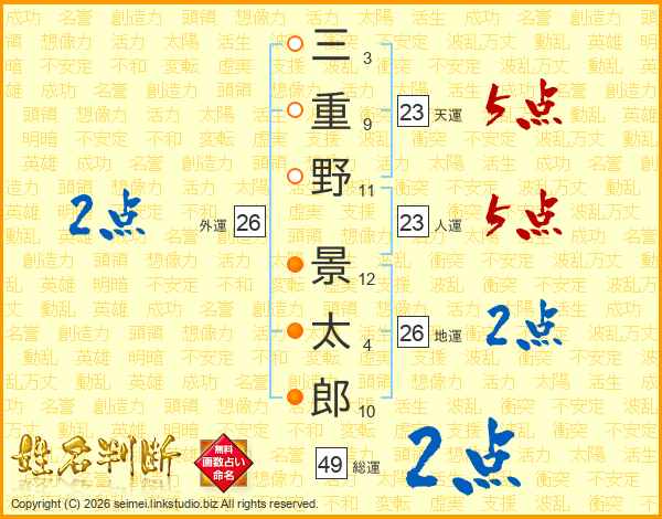 三(3画)重(9画)野(11画) 景(12画)太(4画)郎(10画)