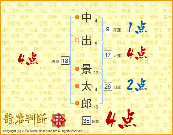 中(4画)出(5画) 景(12画)太(4画)郎(10画)