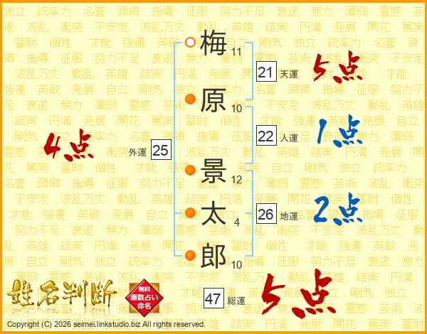 梅(11画)原(10画) 景(12画)太(4画)郎(10画)