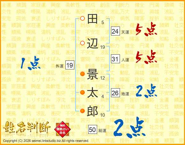 田(5画)辺(19画) 景(12画)太(4画)郎(10画)