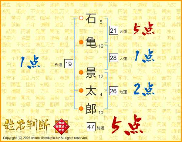石(5画)亀(16画) 景(12画)太(4画)郎(10画)