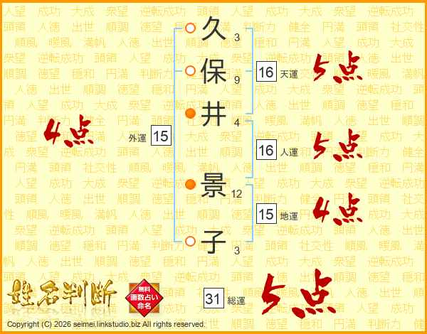 久(3画)保(9画)井(4画) 景(12画)子(3画)