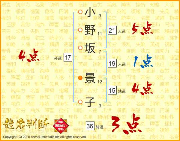生活面を象徴する運勢です。外部から受ける影響力を表し、結婚運、家庭運や職場、環境への順応性を表します。総運から人運を引いた画数。姓や名が1文字の場合を除く。