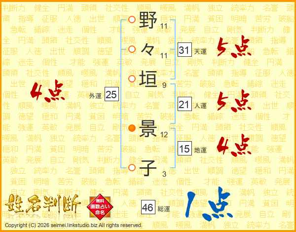 野(11画)々(11画)垣(9画) 景(12画)子(3画)