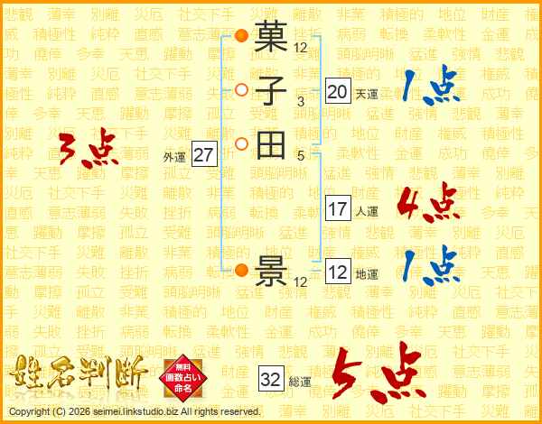 生活面を象徴する運勢です。外部から受ける影響力を表し、結婚運、家庭運や職場、環境への順応性を表します。総運から人運を引いた画数。姓や名が1文字の場合を除く。