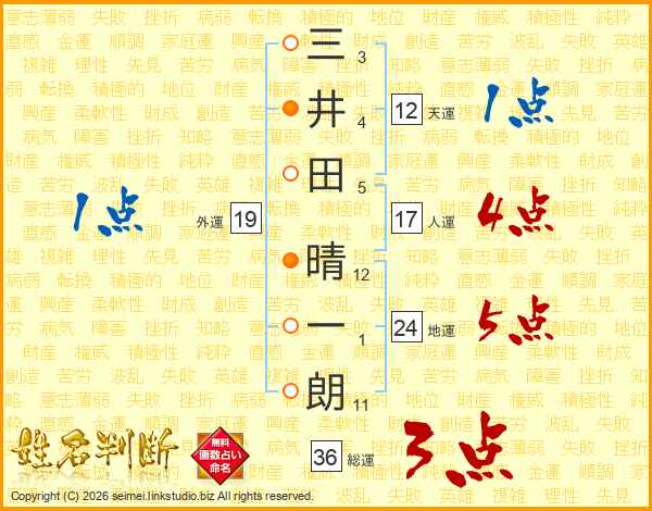 三(3画)井(4画)田(5画) 晴(12画)一(1画)朗(11画)
