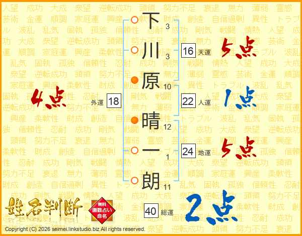 下(3画)川(3画)原(10画) 晴(12画)一(1画)朗(11画)