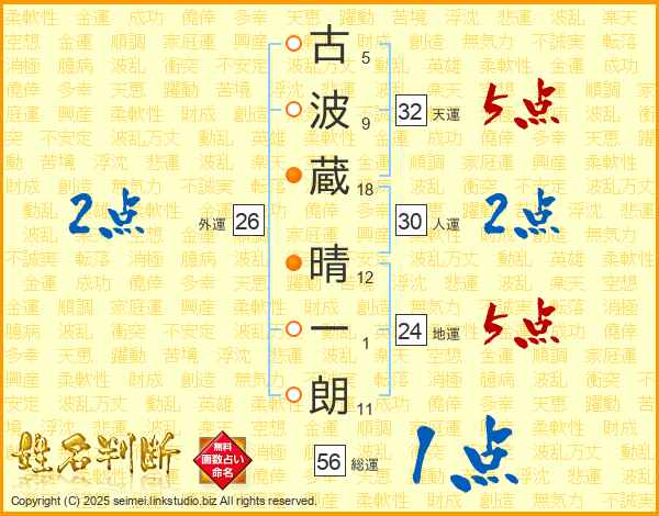 古(5画)波(9画)蔵(18画) 晴(12画)一(1画)朗(11画)