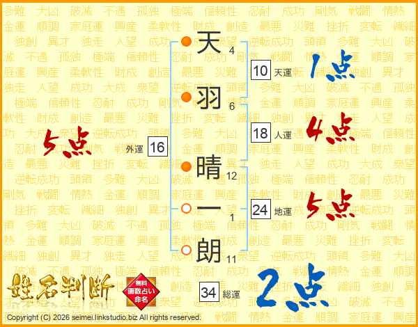 あなたの人生を表す1番重要な運勢です。生涯を通じて影響する総合運となり、主に50歳以降の晩年期に影響を及ぼします。苗字と名前の合計画数。