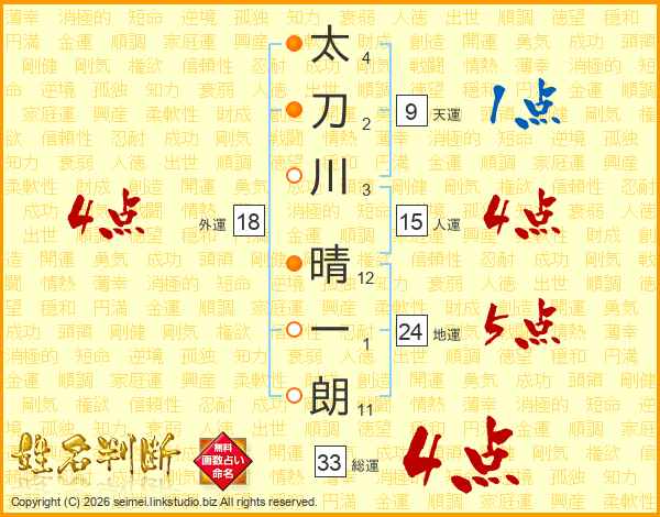 太(4画)刀(2画)川(3画) 晴(12画)一(1画)朗(11画)