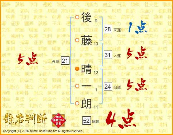 後藤晴一朗さんの総運は52画の4点!