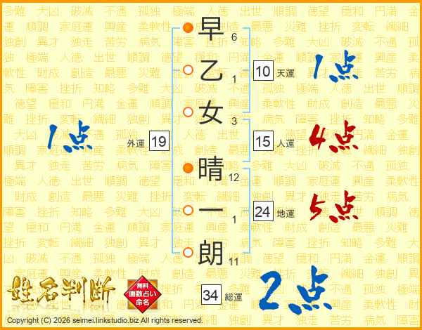 早(6画)乙(1画)女(3画) 晴(12画)一(1画)朗(11画)